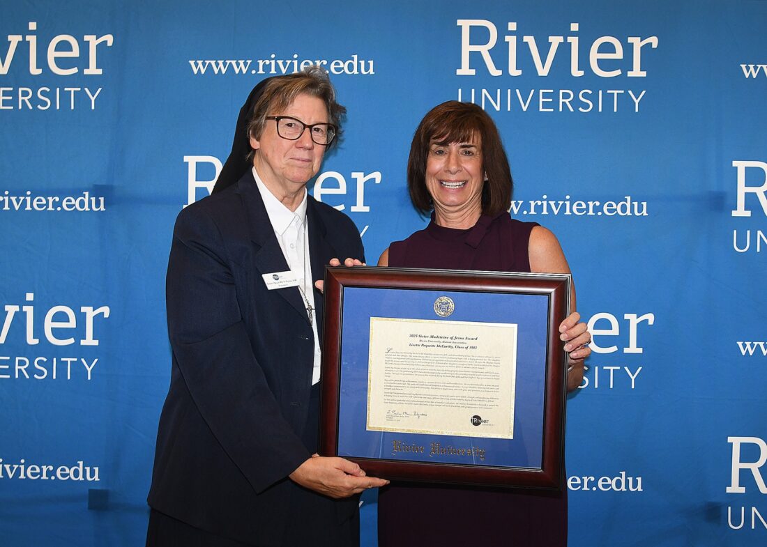 Rivier University President Sister Paula Marie Buley, IHM, (left), recently presented the Sister Madeleine of Jesus Award to 1983 graduate Lisette Paquette McCarthy. Courtesy photo/Rivier University