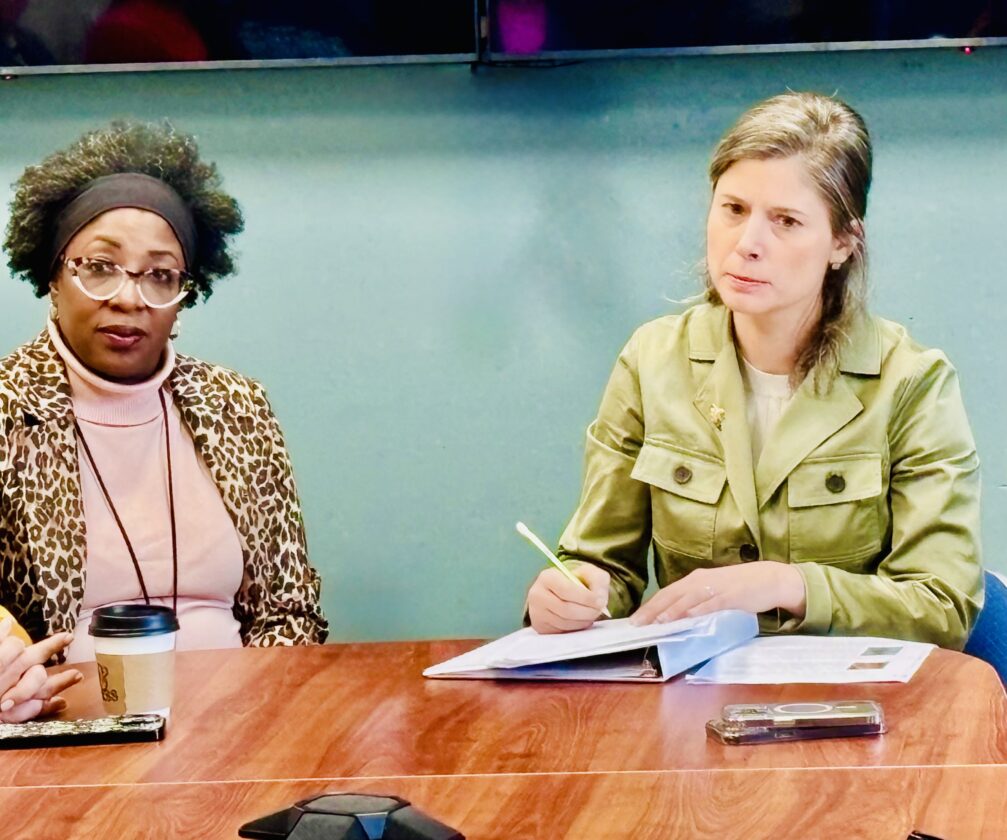 Congresswoman Maggie Goodlander (D-NH) (right) and Bobbie Bagley, Nashua’s public health director, met with local employers and healthcare providers on Oct. 31 to discuss the devastating effects of escalating health insurance premiums. Telegraph photo by CHRISTOPHER ROBERSON