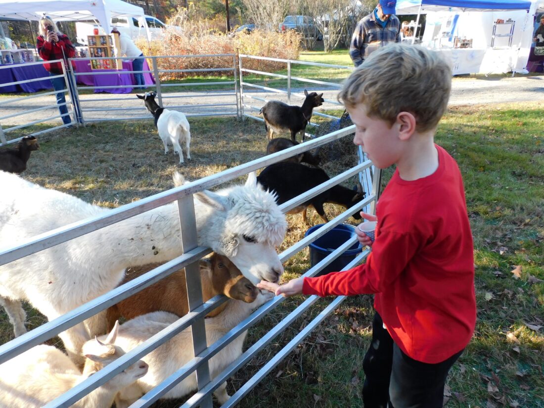 Hugo Van Velzen of Amherst, accompanied by parents David and Martine Van Velzen, joined in the activities of the recent 35th Holiday Open House and Kitty Angels Fundraiser presented Nov. 1-2, where he paused to share some tasty feed pellets with a pure white alpaca, one of the event's petting zoo attractions at the Treasures Antiques, Collectables and More fundraiser presented at Treasures on Ponemah Road in Amherst. Photo by LORETTA JACKSON