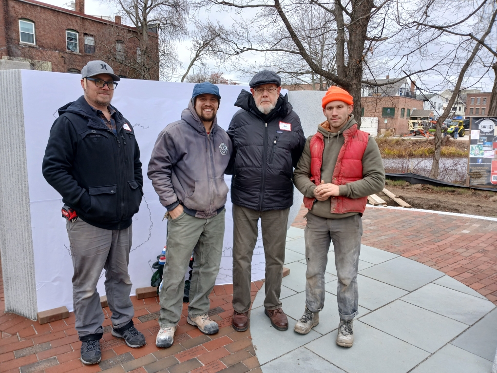 - The craftsmen who applied their skills to creating the Milford Vietnam Veterans Memorial, a work in progress whose two blocks of six tons each of Milford granite are reflective of the open pages of a book, include these citizens, from left, Adam Medlyn (sandblasting), Christopher Tenaglier (stone carver), John Weidman (monument sculptor, technical advisor and Vietnam veteran) and Jim Larson (stone carver). Courtesy photo by Gail Bloom of the Andres Institute of Art