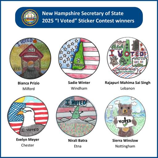 The six winning designs of this year’s I Voted sticker contest. Courtesy photo/New Hampshire Secretary of State