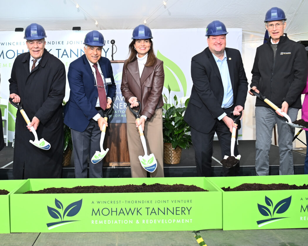 Shown from left is Wincrest Properties President Bernard Plante, Thorndike Development President Lloyd Geisinger, Gov. Kelly Ayotte, EPA New England Administrator Mark Sanborn and Mayor James Donchess during the groundbreaking ceremony of the former Mohawk Tannery Superfund site on Nov. 21. Courtesy photo