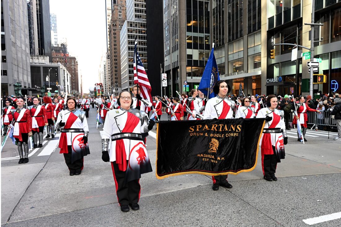 The Spartans Drum and Bugle Corps of Nashua march along Sixth Avenue in New York City during the 99th annual Macy's Thanksgiving Day Parade on Nov. 27. Courtesy photo Kevin McCormick/GroupPhotos.com