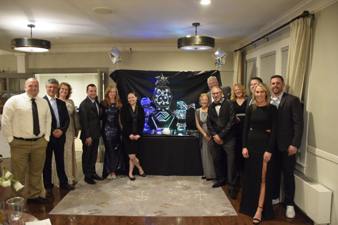 A magnificent ice sculpture, a frozen work of art saluting the recent Silver Jubilee Gala and Auction benefiting the Boys & Girls Club of Souhegan Valley, provides a sparkling centerpiece for party goers, from left, DJ Garcia of Wilton; Dmitri and Irene Bobilev of Lyndeborough; Ben and Jessica Forleo of Merrimack; Amy Garcia of Wilton; Brad Freeman of Lyndeborough, Duane and Karen Forleo of Lyndeborough; Christine Doherty of Lyndeborough; Jason Hacker of Milford and Colin and Stacie Murdough of Lyndeborough. The sculpture was donated by Duane and Karen Forlio and crafted by Dennis Hickey and Dave Soha of Icebreakers in Manchester. Courtesy photo/SVBGC