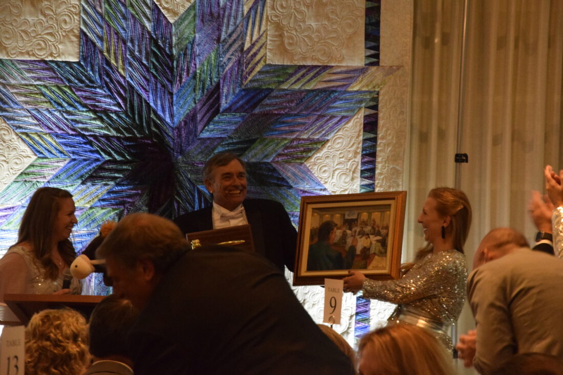 Steve Desmarais of Amherst is presented with a custom painting of himself doing some spirited auctioneering, a work of art gifted to him in appreciation of his extraordinary talents as an auctioneer and his 25 years of dedication to making the SVBGC annual auctions truly special. Courtesy photo/SVBGC