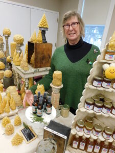 Mary Ellen McKeen, a vendor from Rocky Hill Apiaries in Somersworth who is the president of the New Hampshire Beekeepers Association, offered pure honey, balms and beeswax candles. Photo by LORETTA JACKSON