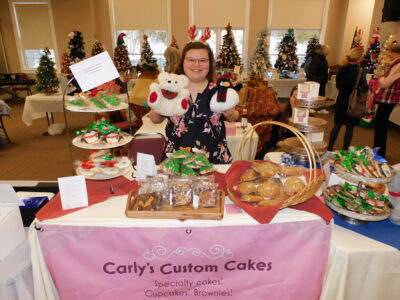- Carly Feins, owner of Carley’s Custom Cakes in Bedford, displays some of her holiday treats including decorated sugar cookies and chocolate brownies. Photo by LORETTA JACKSON