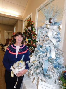 - Stevie Brimblecom, an artistic member of the BWC, displays “Champagne on Ice,” a holiday tree design she highlighted with crystals, ribbon and a bottle of pricey bubbly. Photo by LORETTA JACKSON