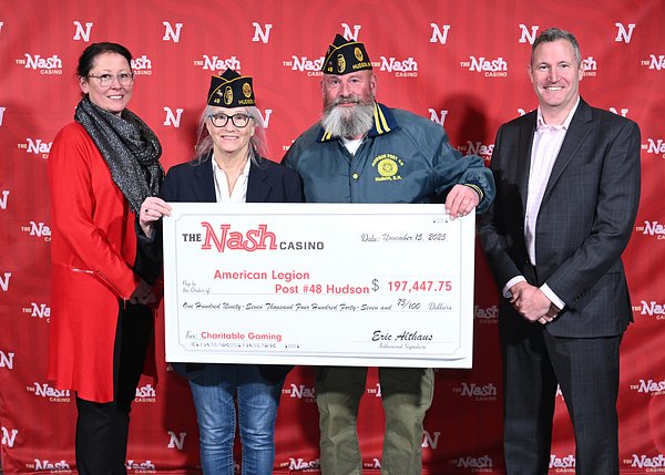 - Shown from left is The Nash Finance Director Jackie Ryan, Valerie Harnadeck, senior vice commander of American Legion Post #48 Hudson, Commander David Mayopoulos and The Nash General Manager Eric Althaus. Courtesy photo/The Nash Casino