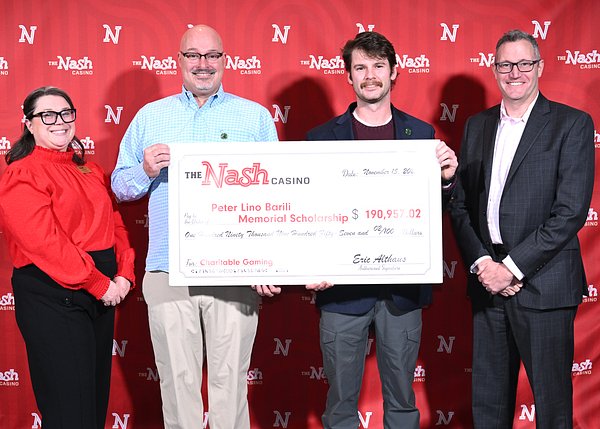 - Shown from left is The Nash Vice President of Marketing Heather Cook-Osolnick, Matthew Landry, board member of the Peter Lino Barili Memorial Scholarship, President-Elect Kyle Strickland and The Nash General Manager Eric Althaus. Courtesy photo/The Nash Casino