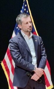 Former U.S. Transportation Secretary Pete Buttigieg listens to residents’ questions during the Feb. 19 community conversation at Nashua Community College. Telegraph photo by CHRISTOPHER ROBERSON