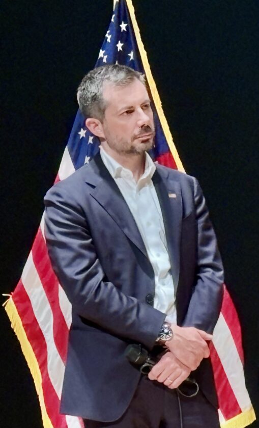 - Former U.S. Transportation Secretary Pete Buttigieg listens to residents’ questions during the Feb. 19 community conversation at Nashua Community College. Telegraph photo by CHRISTOPHER ROBERSON
