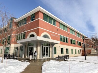 Freedom Energy Logistics energy advisory executives, from left, Bart Fromuth, chief executive officer, Nick Shostak, account executive, and Howard Plante, vice president of procurement, linger to thank Town Council members and attendees at a Merrimack Town Hall information session on Feb. 9 that well informed local electricity consumers about Community Choice Aggregation (CCA), a program wherein municipalities pool their electricity demands to secure competitive rates and encourage community buying power. Photo by LORETTA JACKSON