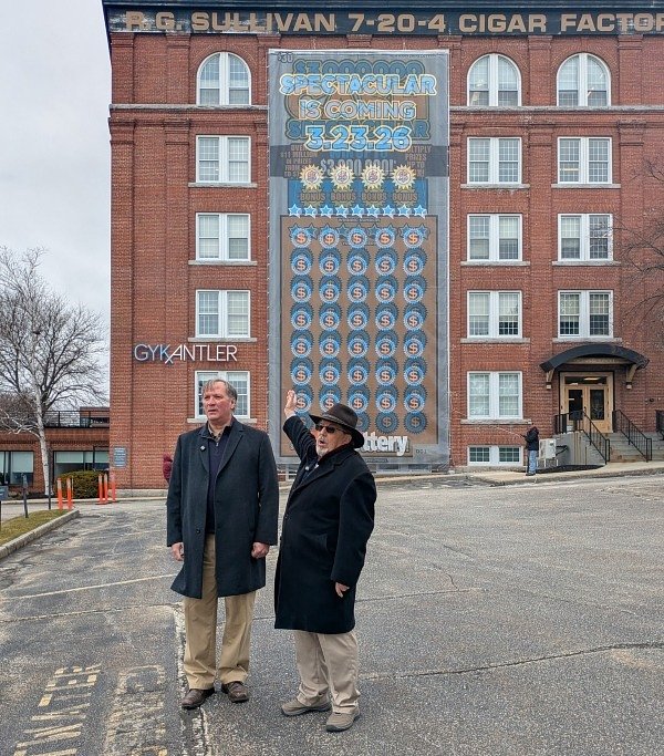 Charles McIntyre, executive director of the New Hampshire Lottery (left) and Lottery Commissioner Erle Pierce recently unveiled the 70-foot-tall banner promoting the $30 $3 million Cash Spectacular on the side of the GYK building at 175 Canal St. in Manchester. Courtesy photo/New Hampshire Lottery