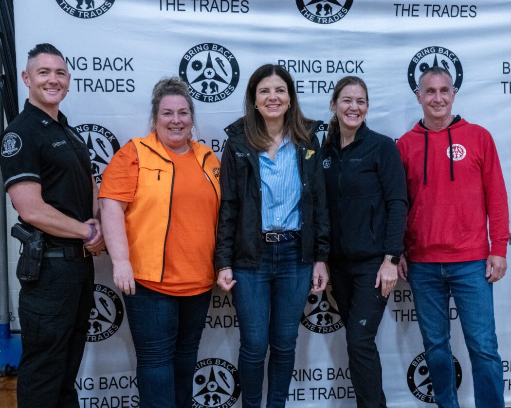 Shown from left, are Londonderry Police Capt. Patrick Cheetham, Londonderry High School Assistant Principal Katie Sullivan, Gov. Kelly Ayotte, BBTT Chief Operating Officer Shana Brunye and BBTT Founder Stephen Turner. Courtesy photo/BRING BACK THE TRADES