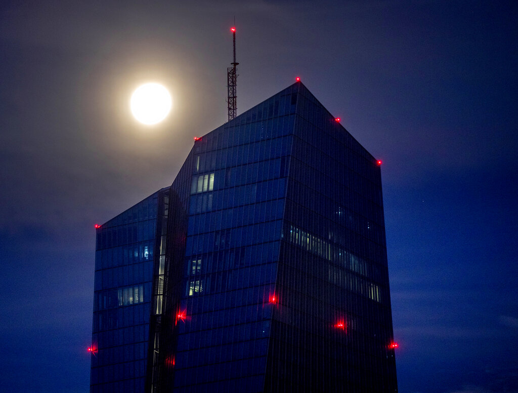 File - In this Thursday, Sept. 3 2020 file picture the moon shines over the European Central Bank in Frankfurt, Germany. Low inflation, in negative territory for the first time since 2016, is leading analysts to think the ECB will have to add more stimulus to support what could be a drawn-out, difficult recovery from the virus outbreak in the 19 countries that use the euro. (AP Photo/Michael Probst, File)