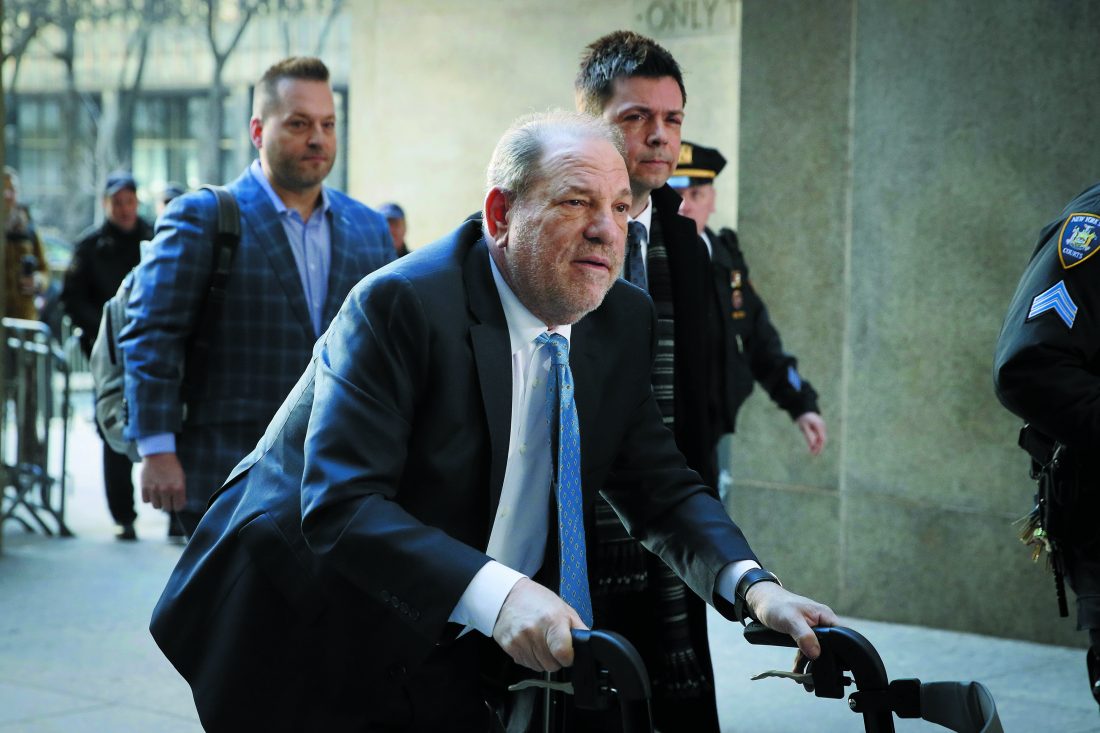 Harvey Weinstein arrives at a Manhattan courthouse as jury deliberations continue in his rape trial, Monday, Feb. 24, 2020, in New York. (AP Photo/John Minchillo)