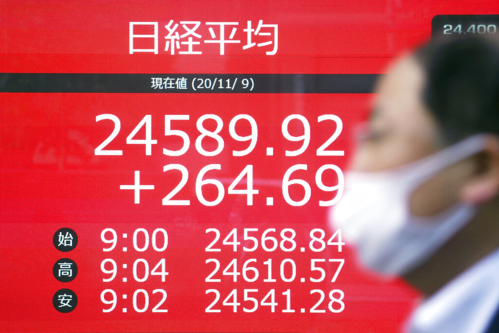 TOKYO (AP) — Stock markets rocketed higher Monday after Pfizer said early data show its coronavirus vaccine is effective and investors breathed a sigh of relief after days of U.S. presidential limbo ended with Democrat Joe Biden declared the president-elect.
