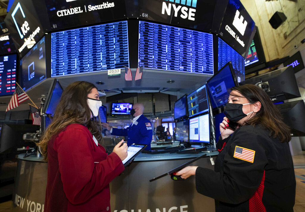 In this photo provided by the New York Stock Exchange, traders Ashley Lara, left, and Phyllis Arena Woods work on the trading floor, Monday, Dec. 14, 2020. Stocks are rising on Wall Street Monday, as the country's first vaccinations against COVID-19 have the end of the pandemic slowly materializing into hazy sight. (Nicole Pereira/New York Stock Exchange via AP)