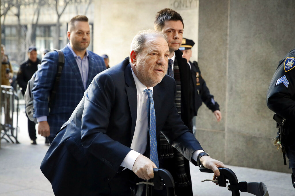 In this Feb. 24, 2020, file photo, Harvey Weinstein arrives at a Manhattan courthouse as jury deliberations continue in his rape trial in New York. A Delaware judge has approved a revised Weinstein Co. bankruptcy plan that provides about $35 million for creditors, with roughly half that amount going to women who've accused Weinstein of sexual misconduct. The judge approved the plan following a hearing and overruled objections by attorneys representing four women. (AP Photo/John Minchillo, File)
