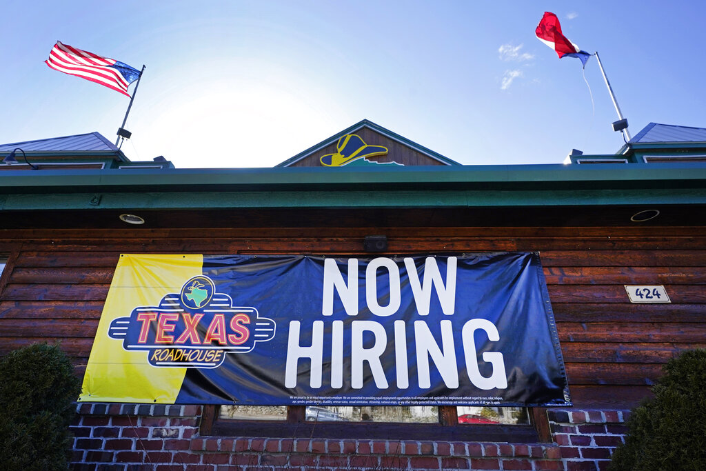 A restaurant displays a "Now Hiring" sign, Thursday, March 4, 2021, in Methuen, Mass. The American job market delivered a surprising burst of strength in February, raising hopes that the rollout of vaccines will allow the U.S. economy to gain momentum as the weather warms up. (AP Photo/Elise Amendola)