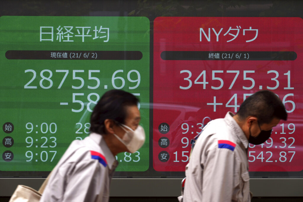 Men wearing protective masks walk in front of an electronic stock board showing Japan's Nikkei 225 and New York Dow indexes at a securities firm Wednesday, June 2, 2021, in Tokyo. Asian shares were mixed on Wednesday after Wall Street began a post-holiday week on a lackluster note. (AP Photo/Eugene Hoshiko)