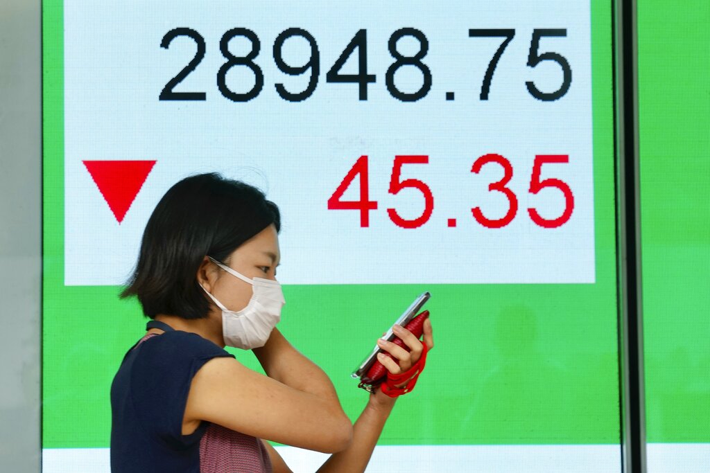 A woman wearing face a mask walks past a bank's electronic board showing the Hong Kong share index in Hong Kong, Wednesday, June 30, 2021. Shares were mostly higher in Asia on Wednesday, despite new data showing factory activity slowed this month as virus outbreaks disrupted shipping at some Chinese ports. (AP Photo/Kin Cheung)