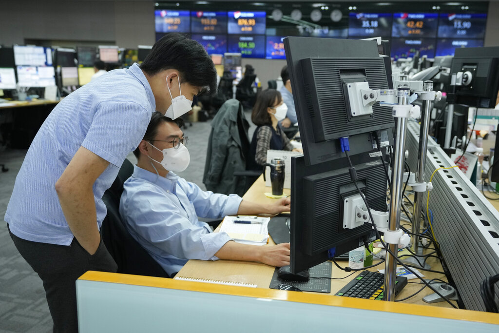 Currency traders watch monitors at the foreign exchange dealing room of the KEB Hana Bank headquarters in Seoul, South Korea, Friday, Oct. 8, 2021. Asian stocks followed Wall Street higher Friday after U.S. lawmakers temporarily averted a possible government debt default while investors waited for American jobs numbers. (AP Photo/Ahn Young-joon)
