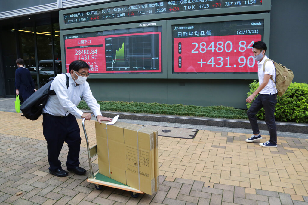 People walk by an electronic stock board of a securities firm in Tokyo, Monday, Oct. 11, 2021. Asian shares were mostly higher on Monday despite persisting worries about the region’s energy crunch and coronavirus infections. (AP Photo/Koji Sasahara)