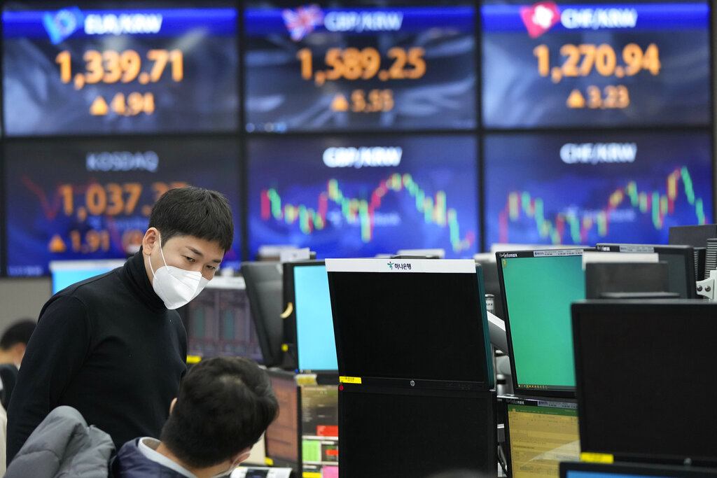 Currency traders talk each other at the foreign exchange dealing room of the KEB Hana Bank headquarters in Seoul, South Korea, Wednesday, Nov. 17, 2021. Asian shares slipped Wednesday despite a rally on Wall Street. (AP Photo/Ahn Young-joon)