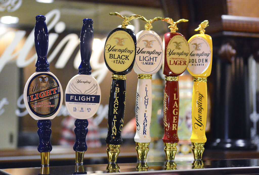 FILE—In this Feb. 21, 2020 file photo, Yuengling's new upscale light beer, Flight, is seen on tap with Yuengling's other beers at D.G. Yuengling & Son's Mill Creek brewery in Pottsville, Pa. A trademark tiff between America’s oldest beer maker and its best-selling beer brand appears to be over before it really began. Last week, D.G. Yuengling & Son demanded its much larger rival, Anheuser-Busch, stop using a tagline for its forthcoming Bud Light Next zero-carb beer. Bud Light had been calling it the “next generation of beer.” Yuengling says that's too close to the trademarked slogan it uses for its Flight low-carb brew. (Lindsey Shuey/Republican-Herald via AP, File)