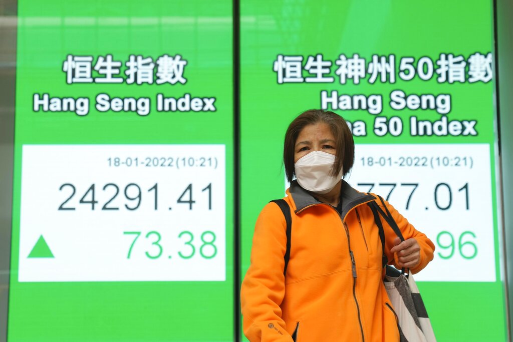 A woman wearing a face mask walks past a bank's electronic board showing the Hong Kong share index in Hong Kong, Tuesday, Jan. 18, 2022. Asian shares were mostly higher Tuesday in the absence of big market-moving news following a national holiday in the U.S. (AP Photo/Kin Cheung)