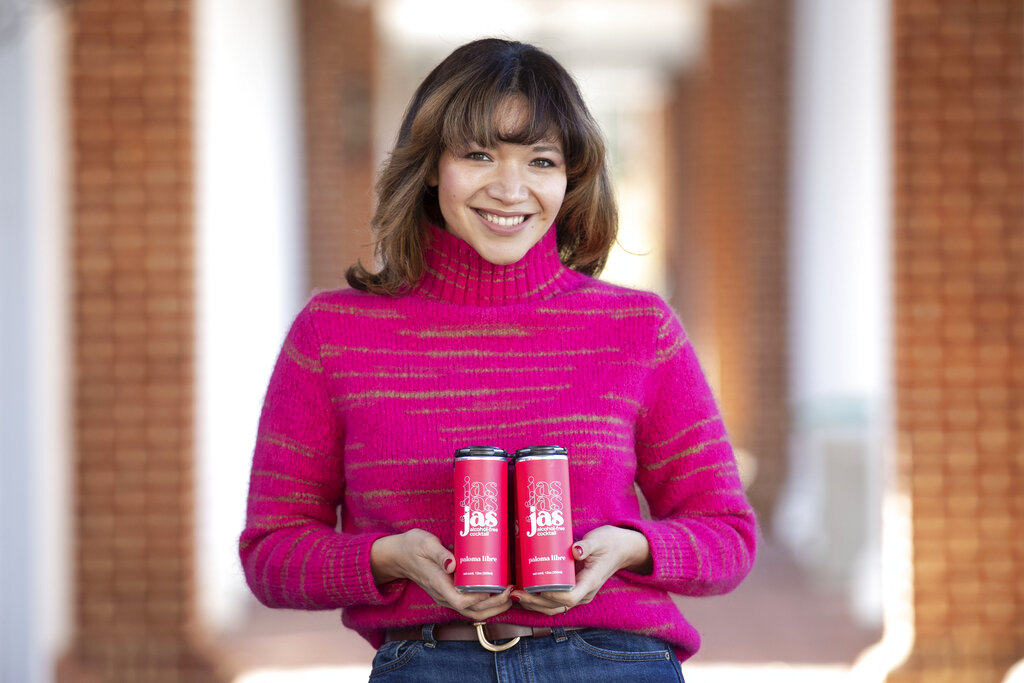A Darden student Cecilia Rios Murrieta, founder of Joie Avec Sans, better known as JAS, an alcohol-free beverage brand, models her beverages at University of Virginia Darden School of Business, Dec. 3, 2021, in Charlottesville, Va. (Erin Edgerton/The Daily Progress via AP)