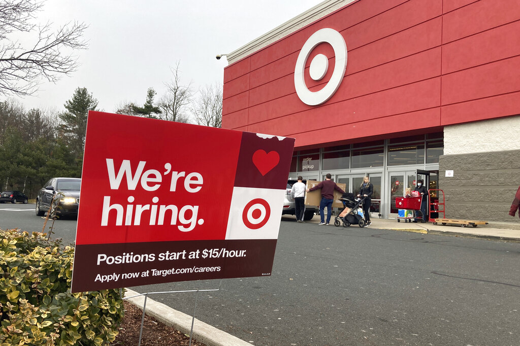 FILE - A hiring sign is in front of a Target store in Manchester, Conn., Nov. 39, 2021. Workers at Target stores and distribution centers in places like New York, where competition for finding and hiring staff is the fiercest, could see starting wages as high as $24 an hour this year. The Minneapolis-based discount retailer said Monday, Feb. 28, 2022 that it will adopt minimum wages that range from $15 to $24 an hour, with the highest pay going to hires in the most competitive markets. It currently pays a universal starting wage of $15 an hour. (AP Photo/Ted Shaffrey)