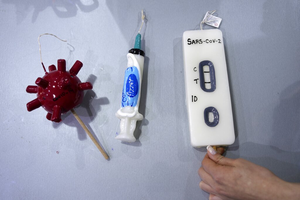 An employee places candles that resemble COVID-19 test kits, vaccination syringes at a store in Athens, Greece, on Tuesday, April 19, 2022. Greeks celebrate Easter with other Orthodox Christians on Sunday, with most restrictions now lifted. A central feature of the celebrations is the Easter candle given as gifts to children, and popular designs are pandemic themed. (AP Photo/Thanassis Stavrakis)