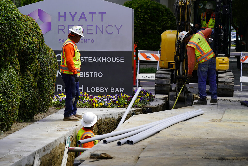 Workers install piping for underground electrical lines in Sacramento, Calif., Wednesday, April 20, 2022. California workplace regulators are poised to extend mandatory pay for workers affected by the coronavirus through the end of 2022, more than two months after state lawmakers restored similar benefits through September. (AP Photo/Rich Pedroncelli)