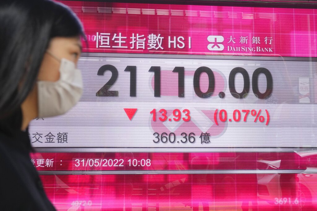 A woman wearing a face mask walks past a bank's electronic board showing the Hong Kong share index in Hong Kong, Tuesday, May 31, 2022. Asian shares were mixed Tuesday after reports showed China's manufacturing slowdown is moderating as anti-virus curbs on businesses in Shanghai and Beijing ease. (AP Photo/Kin Cheung)