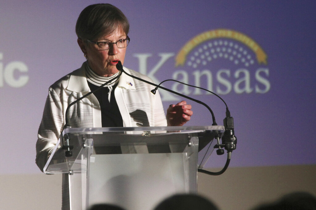 Kansas Gov. Laura Kelly announces that Japan's Panasonic Corp. is planning to build a multi-billion-dollar plant in Kansas for manufacturing electronic vehicle batteries, Wednesday, July 13, 2022, in Topeka, Kan. State officials believe the new plant would employ 4,000 people and that other businesses supplying or supporting it would add several thousand more jobs. (AP Photo/John Hanna)