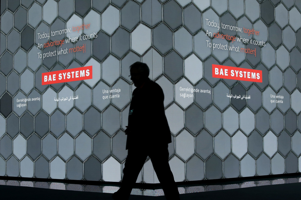 FILE - A man walks past a screen in the BAE Systems chalet at the Farnborough Airshow in Farnborough, England, on July 16, 2018. China announced sanctions Sunday, Jan. 7, 2024 on five American defense-related companies in response to U.S. arms sales to Taiwan and U.S sanctions on Chinese companies and individuals. (AP Photo/Matt Dunham, File)