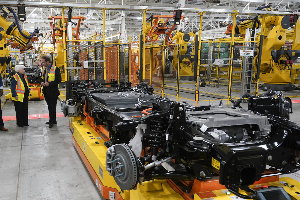 FILE - Treasury Secretary Janet L. Yellen tours the Ford Rouge Electric Vehicle Center before speaking about the Biden Administration's economic agenda in Dearborn, Mich., Sept. 8, 2022. Ford will drastically cut the number of hourly workers at the factory, which builds the Ford F-150 Lightning, as sales of electric vehicles slow. (AP Photo/Paul Sancya, File)