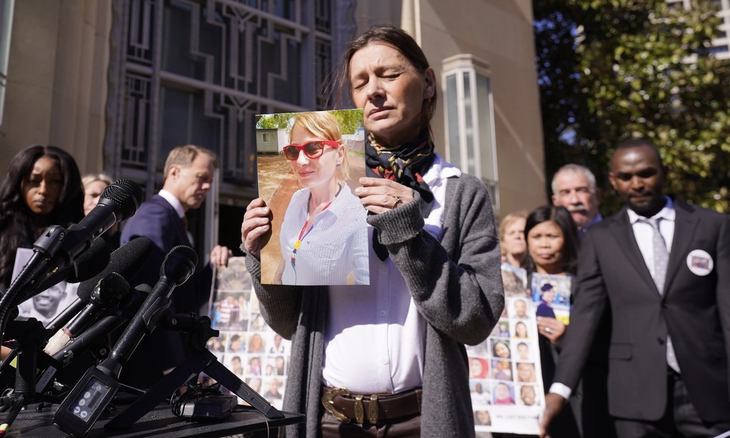 FILE - Catherine Berthet, of France, closes her eyes as she holds a photo of her deceased daughter Camille Geoffroy, in front of other families that lost loved ones to crashes of the Boeing 737 Max airliner outside the federal court in Fort Worth, Texas, Thursday, Jan. 26, 2023. Relatives of passengers who died in two Boeing Max crashes are pushing federal officials to prosecute the company, but they're not getting any promises from the Justice Department.(AP Photo/LM Otero, file)