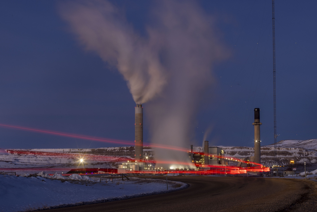 FILE - Taillights trace the path of a motor vehicle at the Naughton Power Plant, Jan. 13, 2022, in Kemmerer, Wyo. Bill Gates and his energy company are starting construction at their Wyoming site adjacent to the coal plant for a next-generation nuclear power plant he believes will “revolutionize” how power is generated. (AP Photo/Natalie Behring, File)