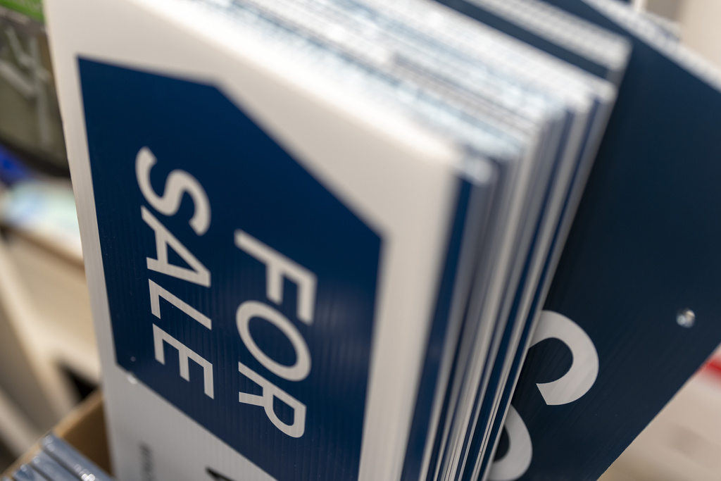 For sale and sold signs are seen in storage at a real estate office on Tuesday, Oct. 15, 2024, in Portland, Ore. (AP Photo/Jenny Kane)
