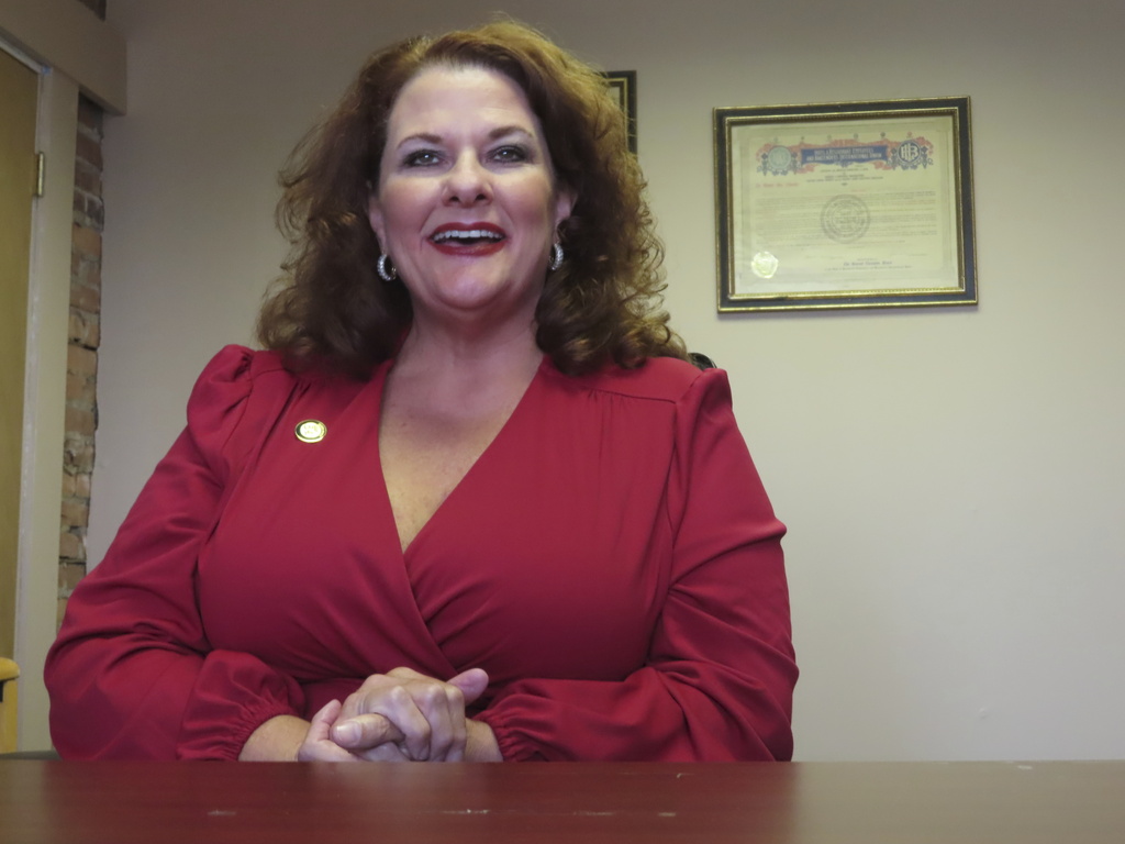 Donna DeCaprio, president of Local 54 of the Unite Here casino workers union, sits at her desk in Atlantic City, N.J. on July 17, 2023. (AP Photo/Wayne Parry)