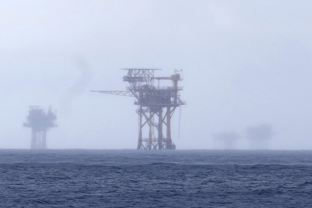 FILE - Oil platforms are visible through the haze near the Flower Garden Banks National Marine Sanctuary in the Gulf of Mexico, off the coast of Galveston, Texas, Saturday, Sept. 16, 2023. (AP Photo/LM Otero, File)