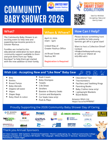 NASHUA – On April 22, the United Way of Greater Nashua will once again turn its office into a welcoming space for new and expecting parents who could use a little extra support.