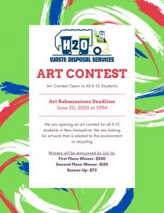 A driver for H20 Waste Disposal Service, a waste management company, was gifted a piece of artwork drawn by a young child, thanking that employee for their work. Consequently, the company decided to sponsor an art contest, where New Hampshire kids could vie for cash prizes by submitting their hand-crafted student art. The prizes are $200 for first place, $150 for second place and $75 for the runner-up. The artwork in this edition was submitted by the following students: Silas (1st grade), New Boston, Anisa (6th grade), Weare, N.H., Zoey (2nd grade, Milford, N.H., Ashley (11th grade), Weare, N.H., Late (5th grade), New Boston, Theo (6th grade), Bedford, N.H., Josephine (2nd grade), New Boston.