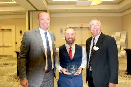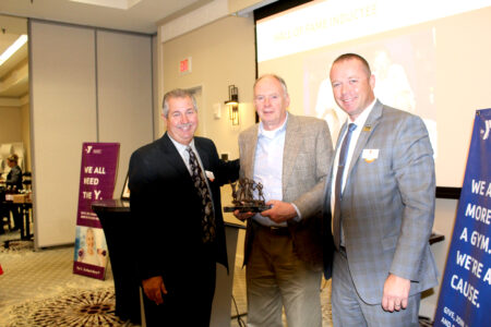 BOTTOM: On behalf of the Hall Family, Elliot Hall accepted the 2022 Hall of Fame recognition. This award is bestowed on an individual or family for five generations of YMCA membership from this Nashua family. Elliot (center) is pictured with YMCA CEO Mike LaChance (left) and YMCA Chief Volunteer Officer Andy Whigham.