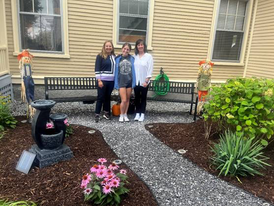 Gold Award Girl Scout Sophia MacDonald, center, stands with Linda Dinndorf, left, and Christine Phillips of Friends of Aine in the garden at the nonprofit in Manchester. MacDonald landscaped the garden to provide a safe place for people grieving lost family members. (Courtesy photo)