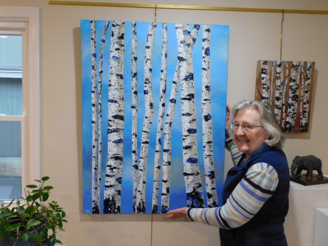 Flakes of peeling white bark stand out almost three-dimensionally against the darker hues of “Beautiful Blue Birches,” an oil painting created with pigment and persistence by Evalyn Maghakian of Brookline.